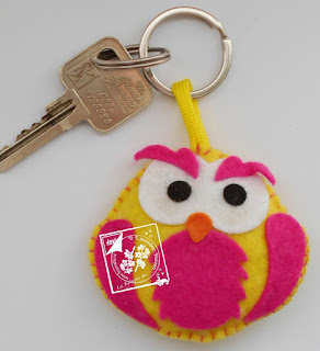 Randjes heb ik dicht genaaid met een leuk siersteekje en op het laatst nog vulling er in gestopt. Met een klein stukje paracord heb ik een lus gemaakt waar ik een sleutelring aan heb gedaan. Vervolgens heb ik de kleine deeltjes zoals de oogjes, het snaveltje en het buikje op het uiltje geplakt met de speciale viltlijm van Joy!Crafts.