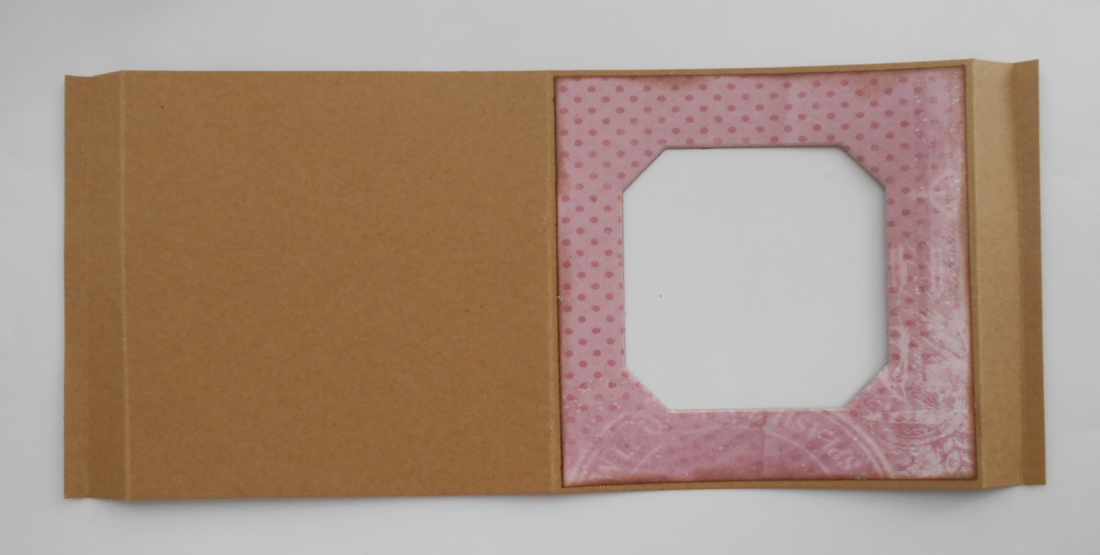 Vervolgens heb ik een design papiertje genomen van 12,5x12,5 en uit het midden heb ik een 8-hoekje gesneden. Die heb ik op het kraft papier geplakt en daarna pas het zelfde 8-hoekje uit het kraft gesneden. Zo heb je het altijd op precies de zelfde plek zitten en verschilt het niet per ongeluk een paar mm.